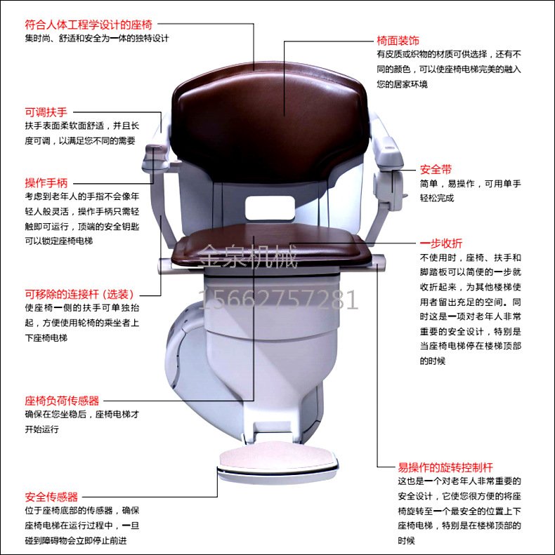 可回收的安全帶放置在座椅上,以充分反映人性的考慮;可折疊的靠墊,扶手和腳踏板充分利用了樓梯的空間;帶方向鎖定的旋轉座椅;使用者可以使用扶手上的方向開關輕松操作座椅,將座椅升高或降低到所需位置;用戶可以使用無線遙控器將座椅向上或向下召喚到您需